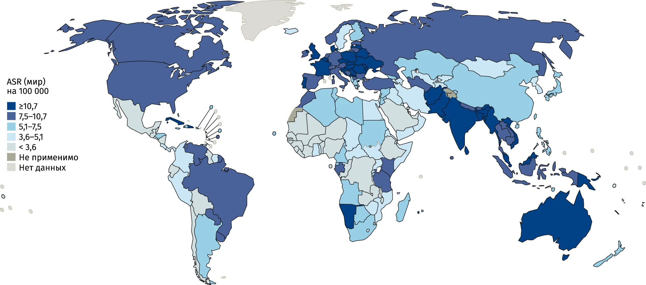 Ориентировочные стандартизированные по возрасту показатели (ASR) частоты новых случаев плоскоклеточной карциномы в области головы и шеи по всему миру показаны совокупно для мужчин и женщин. Данные приводятся на основании GLOBOCAN по состоянию на 2018 г. Эта карта была создана с использованием веб-инструмента GLOBOCAN для создания карт, при этом выбирали следующие варианты локализации рака: «подглоточная область», «гортань», «губы, полость рта», «носоглотка» и «ротоглотка».