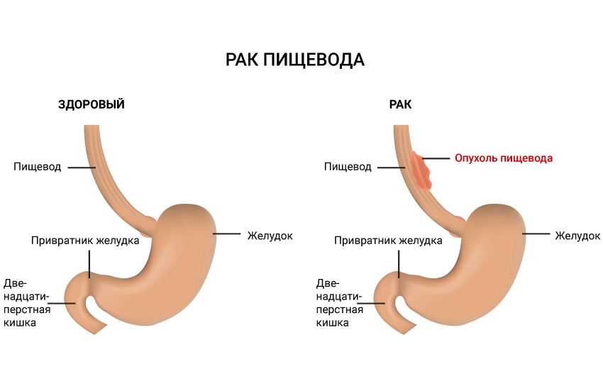 По гистологическому типу рак пищевода подразделяется на плоскоклеточную карциному и аденокарциному. Плоскоклеточная карцинома возникает преимущественно в верхней и срединной трети пищевода, аденокарцинома же — в нижней трети этого органа.
