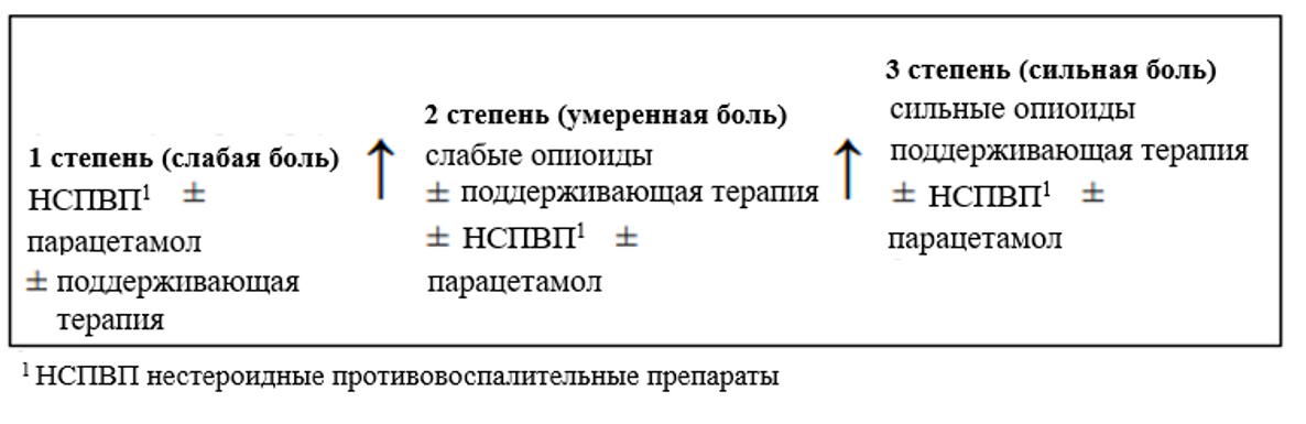 Болеутоляющее средство выбирается соответственно интенсивности боли. Для каждого пациента индивидуально подбирается эффективная именно в его случае, наиболее низкая из возможных доза и наиболее минимальная комбинация лекарств. Противоболевую терапию начинают соответственно интенсивности боли и проводят ее согласно принципам лестницы обезболивания (рисунок 1).
